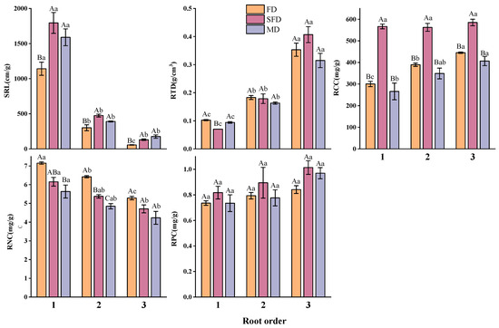 - Beyer, F.; Hertel, D.; Leuschner, C. Fine root morphological and functional traits in Fagus sylvatica and Fraxinus excelsior saplings as dependent on species, root order and competition. Plant Soil 2013, 373, 143–156. [Google Scholar] [CrossRef]