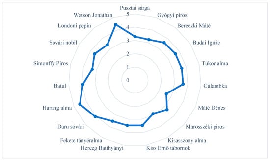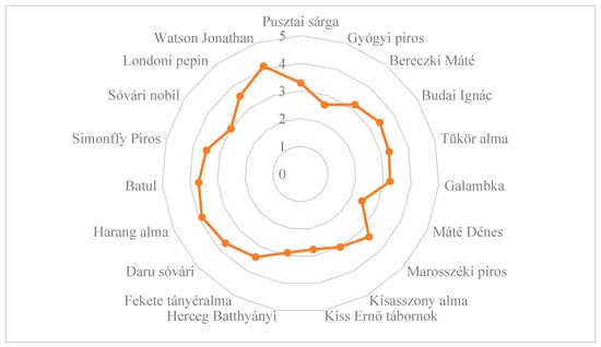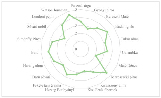 Based on the opinions of the reviewers, only three of the old, local apple cultivars (‘Batul’, ‘Harang alma’, and ‘Daru sóvári’) attained points for the shapes and sizes of the fruits similar to those for the commercial cultivars (Figure 1). ‘Máté Dénes’ was awarded the lowest points: the shapes and sizes of its fruit were the least liked by the reviewers.