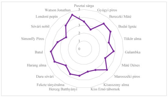 In terms of taste, the ‘Marosszéki piros’ cultivar received the best score, which was similar to that of the ‘Watson Jonathan’ cultivar, while the ‘Máté Dénes’ cultivar received the worst score (Figure 5).