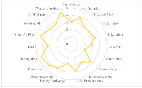The texture of the flesh of the ‘Londoni pepin’, ‘Batul’, ‘Harang alma’, ‘Marosszéki piros’, ‘Galambka’, ‘Budai Ignác’, and ‘Bereczki Máté’ cultivars was found to be similar to that of ‘Golden Delicious’ based on consumer evaluation (Figure 2). The texture of the ‘Gyógyi piros’ and ‘Sóvári nobil’ fruit was the least liked by the reviewers.