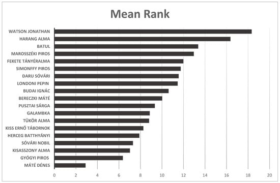 The Mean Rank for the old, local apple cultivars based on the consumer evaluations was useful in determining which cultivars were most preferred by the testers, providing valuable information for growers and customers. In terms of Mean Rank, the ‘Harang alma’ cultivar almost reached the ‘Watson Jonathan’ apple cultivar, while the reviewers liked ‘Máté Dénes’ the least (Figure 6).