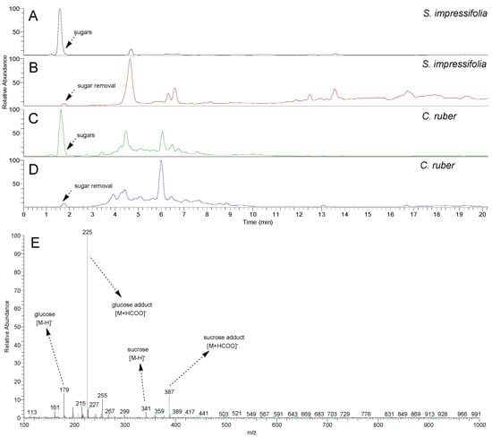 The LC-MS chromatograms of the aqueous extracts of S. impressifolia (Figure 1A) and C. ruber (Figure 1C) revealed the presence of major peaks, with a retention time of 1.60 min in both samples. Through the analysis of the full scan mass spectra of these peaks (Figure 1E), it was possible to observe the presence of characteristic ions of sugars, such as m/z 179 and 225 (glucose and adduct) and m/z 341 and 387 (sucrose and adduct), commonly found in plant matrices [].
