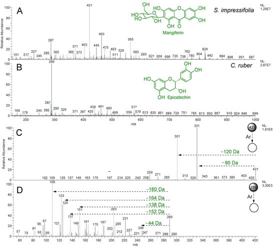 Mass spectra (negative mode) of the methanol fractions of S. impressifolia (A) and C. ruber (B), and MS/MS spectra of the ions at m/z 421 (C) and 289 (D).