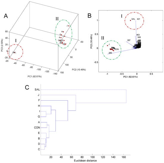PCA score plots (A) and biplot (B) based on the chemical profile obtained using DI-MS of commercial samples (A–J) and samples of S. impressifolia (SAL) and C. ruber (CON), along with the HCA dendrogram (C).