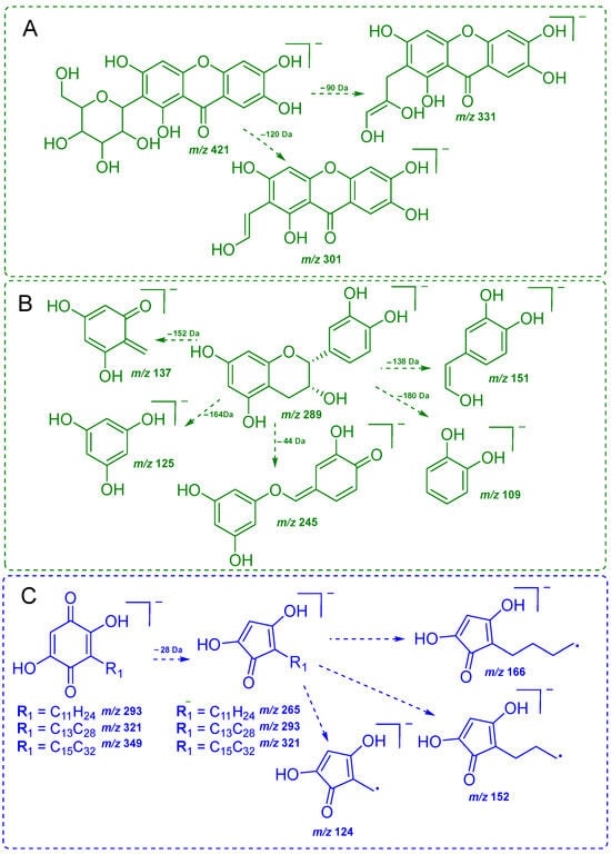 Proposed fragmentation pathways for mangiferin (m/z 421) (A), epicatechin (m/z 289) (B), and embelin (m/z 293), rapanone (m/z 321), and suberonone (m/z 349) (C).