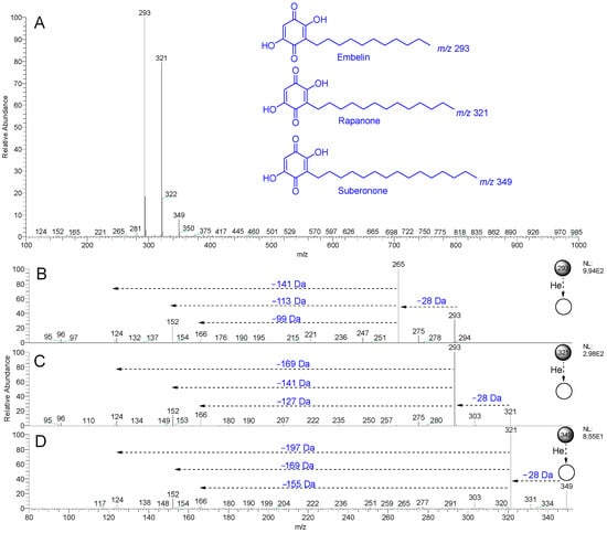 The DI-MS spectrum in the negative mode of the hexane extract of C. ruber revealed a base peak at m/z 293, another intense ion at m/z 321, and a minor ion at m/z 349 (Figure 5A). The commercial samples (A–J) also exhibited similar chemical profiles (Supporting Information—Figures S11–S20). The MS/MS spectra of these ions (Figure 5B–D) showed an initial loss of 28 Da (m/z 293 → 265; m/z 321 → 293; m/z 349 → 321), as well as common fragment ions at m/z 166, 152, 124, and 96 (Figure 4C), resulting from radical losses, all consistent with the benzoquinones embelin, rapanone, and suberonone []. The ions at m/z 293, 321, and 349 detected in the commercial samples (A–J) exhibited similar MS/MS spectra. A comparable benzoquinone profile has also been reported in the root wood ethyl acetate extract of C. suberosus []. Taken together, these observations reinforce the hypothesis that C. ruber or Connarus species are the main botanical sources of miraruira sold in the state of Amazonas.