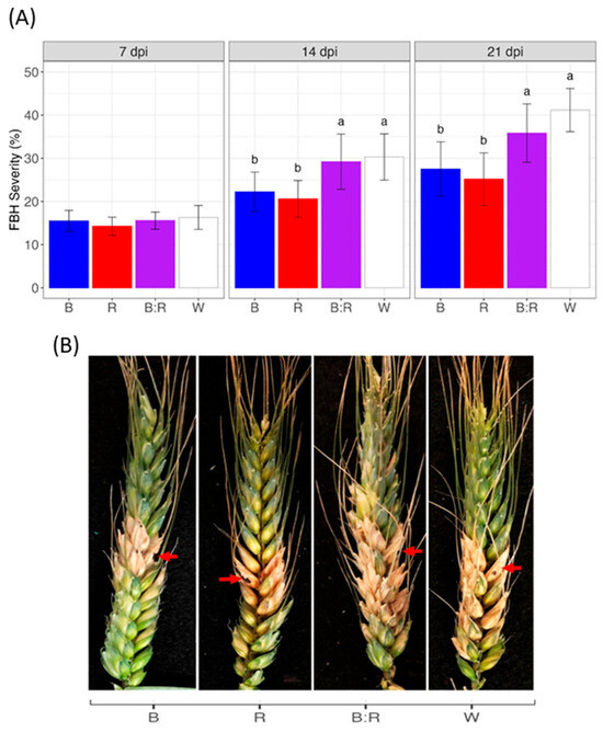 Effect of light spectra on Fusarium head blight (FHB) development in bread wheat. Heads were artificially inoculated with a conidial suspension (107 conidia mL−1) of F. graminearum strain 56 and, after 48 h, incubated at 20 °C with exposure to blue (B), red (R), blue/red (B:R), and white (W) light. (A) Disease severity was evaluated at 7, 14, and 21 days post inoculation (dpi). Means with different letters are significantly different at p < 0.05, according to Tukey’s honestly significant difference (THSD) test on square root transformed data (to meet the basic assumptions for linear model fitting). Vertical bars indicate the average (±standard error) of the replicates. (B) FHB symptoms at 21 dpi in bread wheat plants under different light conditions. Red arrows indicate the inoculation point.