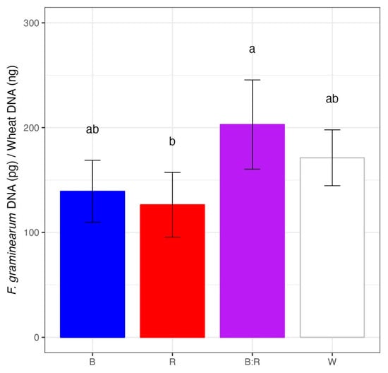 F. graminearum strain 65 DNA detected at 60 days post inoculation (dpi) in wheat heads grown under blue (R), red (R), blue/red (B:R), and white (W) light. After 60 dpi, inoculated heads were ground, and F. graminearum DNA was quantified by qPCR. The fungal DNA amount was expressed as the ratio of fungal DNA (pg) on wheat head DNA (ng). Means with different letters are significantly different at p < 0.05, according to Tukey’s honestly significant difference (THSD) test on square root transformed data (to meet the basic assumptions for linear model fitting). Vertical bars indicate the average (±standard error) of replicates.