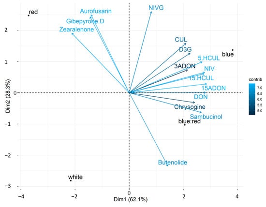Secondary metabolite principal component analysis. The variability of 15 secondary metabolites (4 light conditions with 6 replicates each) is highlighted in a two-dimensional space. The variance explained by the first two components was 62.1% and 28.3%, respectively. The contribution of variables is perceived as a color gradient. Results for deoxynivalenol (DON), 3-acetildeoxynivalenol (3ADON), 15-acetildeoxynivalenol (15ADON), deoxynivalenol 3-glucoside (D3G), nivalenol (NIV), nivalenol glucoside (NIVG), culmorin (CUL), 5-hydroxyculmorin (5.HCUL), and 15-hydroxyculmorin (15.HCUL) are shown.