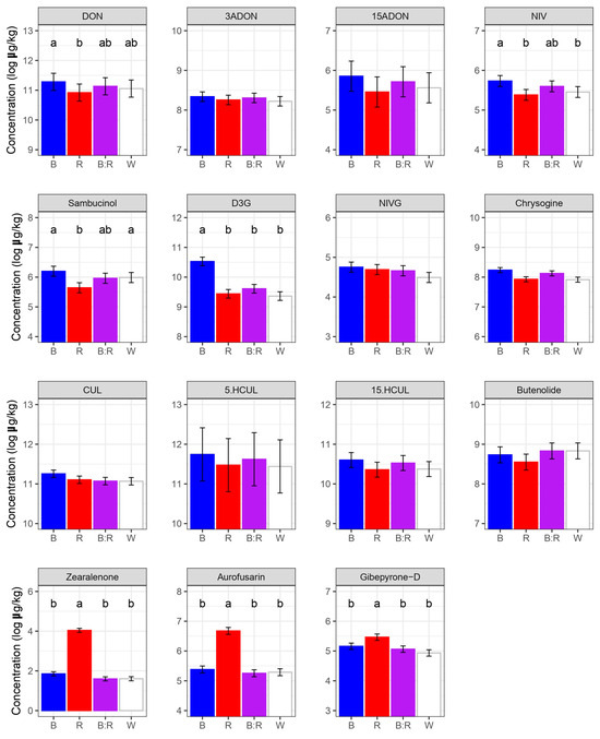 F. graminearum secondary metabolites detected in inoculated heads under blue (R), red (R), blue/red (B:R), and white (W) light. At 60 days post inoculation, inoculated heads were analyzed by LC-MS/MS. Results represent the average log-transformed concentration of F. graminearum secondary metabolites (±standard error of the difference), based on two independent experiments each including three replicates per treatment. Means with different letters are significantly different at p < 0.01, according to Tukey’s honestly significant difference (THSD) test on log-transformed data (to meet the basic assumptions for linear model fitting). Absence of letters indicates no differences among treatments. Results for deoxynivalenol (DON), 3-acetildeoxynivalenol (3ADON), 15-acetildeoxynivalenol (15ADON), deoxynivalenol 3-glucoside (D3G), nivalenol (NIV), nivalenol glucoside (NIVG), culmorin (CUL), 5-hydroxyculmorin (5.HCUL), and 15-hydroxyculmorin (15.HCUL) are shown.