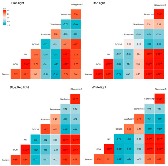 Correlation between fungal DNA and seven secondary metabolite concentrations in response to the four different light treatments applied. Pearson’s correlation coefficient analysis evaluated the relationship between F. graminearum DNA and mycotoxins that showed a differential production in response to light. Significance codes: p < 0.001 ‘***’, p < 0.01 ‘**’, and p < 0.05 ‘*’.