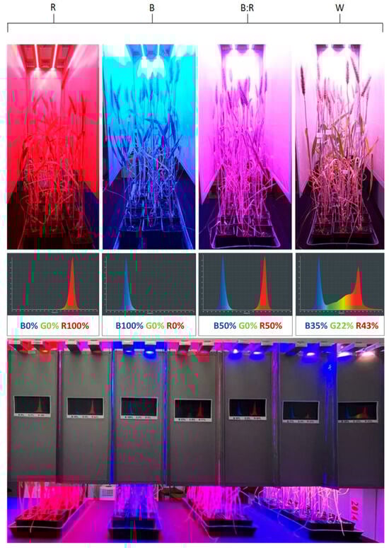 Four different light treatments were applied, involving different light spectra. Blue (peak wavelength 470 nm), red (peak wavelength 627 nm), blue/red (50:50 ratio), and white light were applied using an LED lighting system (Figure 6). The LED system used has been described previously [80]. This system uses Philips Lumileds Luxeon Rebel LEDs, with each DSA3 lamp containing seven LED types that emit distinct wavelengths: royal blue (448 nm), blue (470 nm), cyan (505 nm), green (530 nm), amber (590 nm), red (627 nm), and deep red (655 nm). All four light spectra were administered with an equal cumulative photon flux density of 200 μmol photons m−2 s−1 under a 12 h light photoperiod.