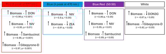Considering that DON acts as a virulence factor facilitating F. graminearum colonization of wheat [46,47], a positive correlation between fungal amounts and DON concentration was expected in response to all light treatments. Indeed, a positive correlation was observed between fungal DNA and trichothecene levels in response to different lights (Figure 5). The amount of F. graminearum DNA significantly correlated with both DON and NIV concentrations under red (DON: r = 0.98, p < 0.001 | NIV: r = 0.95, p < 0.01) and blue/red (DON: r = 0.86, p < 0.05 | NIV: r = 0.84, p < 0.05) light. NIV also showed a significant association in blue light (NIV: r = 0.81, p < 0.05), while neither DON nor NIV demonstrated a significant relation with F. graminearum levels under white light (DON: r = 0.73 | NIV: r = 0.76). Interestingly, F. graminearum DNA and sambucinol also showed a positive and significant association under red (r = 0.98, p < 0.001) and blue/red (r = 0.89, p < 0.05) wavelengths. In conclusion, F. graminearum DNA positively correlated with DON concentration in all conditions, even if this correlation was not always significant. The reduction in F. graminearum amounts led to a lower DON concentration, and vice versa. A correlation analysis was performed to reveal any possible association between DON and D3G. A positive (r = 0.706) but non-significant correlation was observed between DON and D3G concentrations under blue light treatment. In contrast, DON and D3G showed a negative association under red (r = −0.684), blue/red (r = −0.82, p < 0.05), and white light conditions (r = −0.88, p < 0.05).