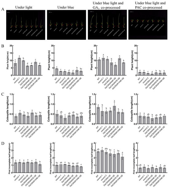 Plant height, coleoptile length, and first incomplete leaf of WT and OsCSN2 mutants under different condition treatments. The red arrow in the figure points to the coleoptile, and the yellow arrow in the figure points to the first incomplete leaf. (Different letters within the same group indicate significant differences (p ≤ 0.05), while the same letters indicate no significant differences.) (A) The aboveground of WT and OsCSN2 mutants grown for 9 days under natural light, blue light, blue light and GA3 co-treatment, and blue light and PAC co-treatment. (B) Plant height data graph of WT and OsCSN2 mutants grown 9 days under light, blue light, blue light and GA3 co-processed, blue and PAC co-processed. (C) Coleoptile length data graph of WT and OsCSN2 mutants grown 9 days under light, blue light, blue light and GA3 co-processed, and blue light and PAC co-processed. (D) First incomplete leaf length data graph of WT and OsCSN2 mutants grown 9 days under light, blue light, blue light and GA3 co-processed, and blue light and PAC co-processed.