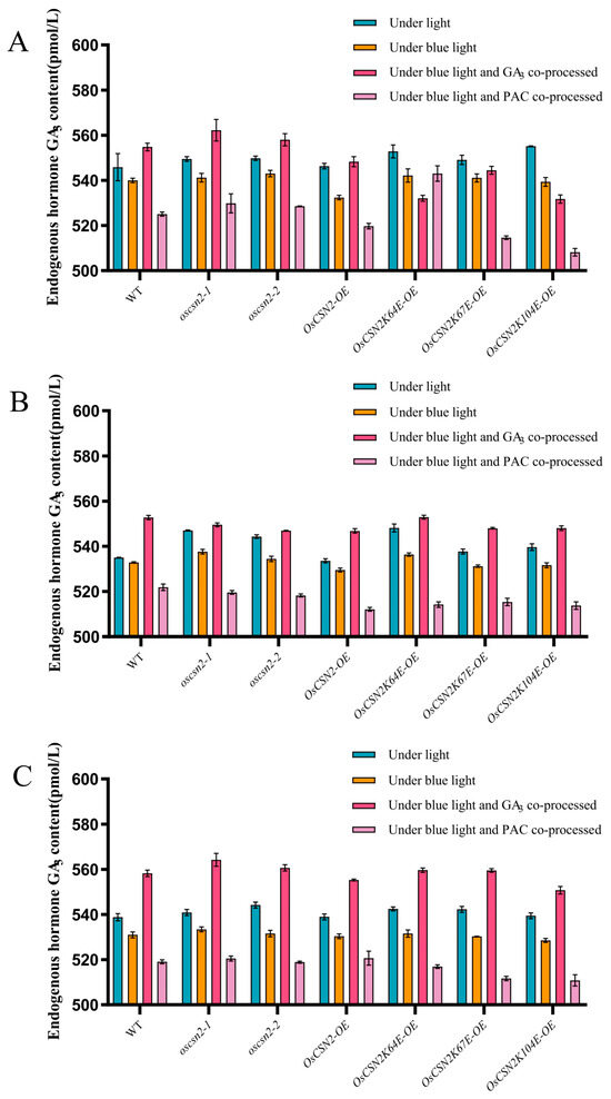 Under natural light conditions, oscsn2-1 and oscsn2-2 were significantly higher than the WT. Among the OsCSN2 point mutants, the plant heights of OsCSN2K64E-OE, OsCSN2K67E-OE, and OsCSN2K104E-OE were greater than that of OsCSN2-OE, but those of OsCSN2-OE were shorter than those of the WT (Figure 1A,B). These results suggest that OsCSN2 has an inhibitory effect on plant height elongation in rice. Under blue light irradiation conditions, the plant heights of the WT and OsCSN2 mutants decreased overall and the plant heights of the mutants were all shorter than the WT plant height, but the plant heights of oscsn2-1 and oscsn2-2 were significantly greater than that of OsCSN2-OE (Figure 1A,B); blue light significantly inhibited the increase in plant height. In addition, the endogenous hormone GA3 was measured in the stems of the rice plants. The results revealed that the overall hormone levels decreased significantly, and those of OsCSN2-OE were the lowest (Figure 2A). OsCSN2 may be inhibited by affecting the expression of the endogenous hormone GA3 through blue light. OsCSN2 is a negative regulator of blue light morphogenesis. Under co-treatment with blue light and the exogenous hormone GA3, oscsn2-1, oscsn2-2, and OsCSN2-OE restored plant height under natural light conditions (Figure 1A,B), and the expression of the endogenous hormone GA3 also increased significantly (Figure 2A). In particular, the heights of the plants in the OsCSN2K67E-OE and OsCSN2K104E-OE groups were significantly greater than those in the natural light group (Figure 1A,B). This demonstrated that the application of the exogenous hormone GA3 also promoted endogenous hormone levels in rice seedlings. OsCSN2 may rescue the inhibitory effect of blue light on the height of mutant plants, possibly through the GA signaling pathway. The changes in the OsCSN2 point mutants may be related to the ubiquitylation of the point mutants, and the responses to GA3 are different, thus regulating the growth trend. After the addition of the exogenous hormone PAC, the plant height of all the rice seedlings was inhibited, and OsCSN2-OE was the most sensitive (Figure 1A,B). The endogenous hormone GA3 was also significantly inhibited (Figure 2A).