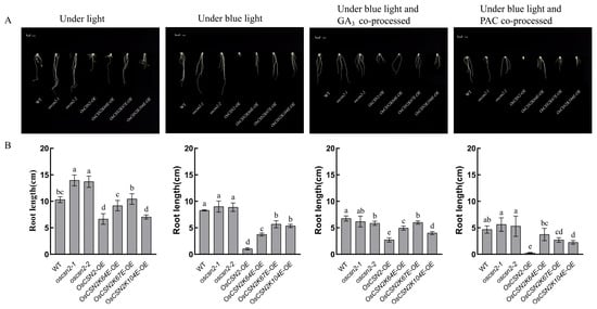 Root length of WT and OsCSN2 mutants under different condition treatments. (A) Root length of WT and OsCSN2 mutants grown for 9 days under natural light, blue light, blue light and GA3 co-treatment, and blue and PAC co-treatment. (Different letters within the same group indicate significant differences (p ≤ 0.05), while the same letters indicate no significant differences.) (B) Root length data graph of WT and OsCSN2 mutants grown 9 days under light, blue light, blue light and GA3 co-processed, and blue and PAC co-processed.