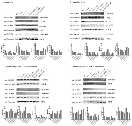 Changes in expression of related proteins under different treatments in WT and OsCSN2 mutants. (A) Under light. (B) Under blue light. (C) Under blue light and GA3. (D) Under blue light and PAC.