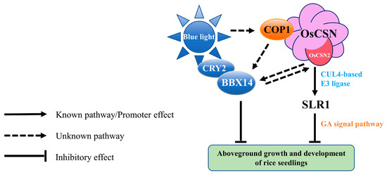 In summary, the expression level of OsBBX14 in OsCSN2-OE was significantly greater than that in the WT and knockout mutant lines, suggesting the inhibitory role of OsBBX14 in blue light morphogenesis [25]. The changes in phenotype characteristics and gene expression levels confirmed that OsCSN2 may be a negative regulator under blue light conditions and acts synergistically with OsBBX14. OsCSN2 may coordinate the degradation of SLR1 in the GA signaling pathway through the blue light receptors CRY2 and COP1 to regulate rice seedlings. OsCSN2 also regulates this process through the CUL4-based E3 ubiquitin ligase (Figure 6). Ultimately, endogenous hormone changes and phenotypic growth and developmental changes were most significant in rice seedlings aboveground.
