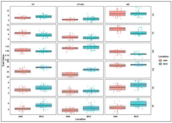 Grouped boxplots of lentil seed yield and nutritional quality traits variation across treatments and locations. SY, Seed yield; CT, Cooking time; PC, Protein concentration; PA, Phytic acid; Zn, Zinc; Fe, Iron; MCH, Marchouch; ANN, Annoceur; NR, Normal condition; HT, Heat stress; HT+DH, Combined heat and drought stresses.