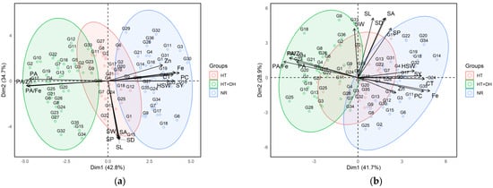 Principal component analysis and traits contributing to the variability under normal, heat, and combined heat and drought stress conditions across Marchouch (a) and Annoceur (b) research stations. Fe, Iron; Zn, Zinc; PA, Phytic acid; PC, protein concentration; CT, Cooking time; SY, Seed yield; HSW, hundred seed weight; SL, Seed length; SW, Seed width; SA, Seed area; SP, Seed perimeter; SD, Seed diameter, HT; heat stress, HT + DH, combined heat and drought; NR, normal condition.