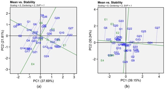 In this study, we identified the optimum genotype using the mean versus stability view of the GGE biplot. The mean performance and stability of 36 genotypes was assessed through the two PCAs and the projections from the abscissa toward the average environment coordinate ordinates (AEC). The abscissa and ordinate of the Average Environment Coordinate (AEC) are two lines that pass through the origin of the biplot, based on singular value partitioning (SVP = 1). The AEC abscissa is represented by a single-direction arrow, indicating the ideal genotype’s main effect, while the AEC ordinate, with a single arrow extending outside the biplot, highlights the greater mean performance of each genotype (Figure 4). The projection magnitude into the AEC ordinate determines the stability of the genotypes; consequently, a greater projection regardless of the direction signifies greater instability in the genotype.