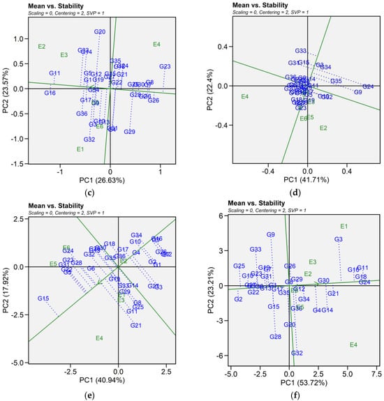 Patterns (a–f). Mean vs. stability based on PC1 and PC2 illustrating G × E interactions of the 36 lentil accessions under six environments. (a) SY, Seed yield; (b) Fe, Iron; (c) Zn, Zinc; (d) PA, Phytic acid; (e) PC, Protein concentration; (f) CT, Cooking time. The mean vs. stability was based on scaling = 0, centering = 2, and singular value partitioning (SVP) = 1.