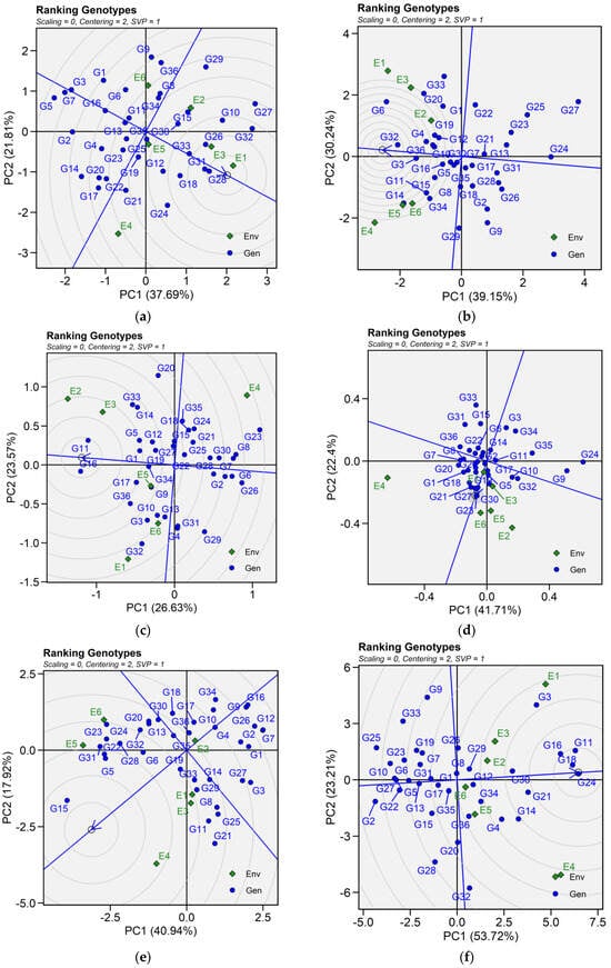 Patterns (a–f). Ranking genotypes biplots based on PC1 and PC2 illustrating G × E interactions of the 36 lentil accessions under six environments. (a) SY, Seed yield; (b) Fe, Iron; (c) Zn, Zinc; (d) PA, Phytic acid; (e) PC, Protein concentration; (f) CT, Cooking time. The mean vs. stability was based on scaling = 0, centering = 2, and singular value partitioning (SVP) = 1.