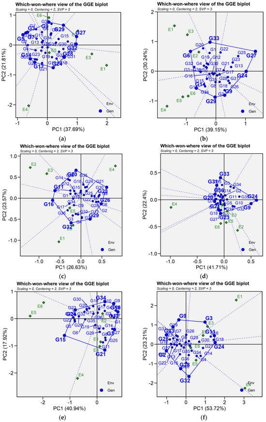 Patterns (a–f). Which-won-where view of GGE biplots based on PC1 and PC2 illustrating G × E interactions of the 36 lentil accessions under six environments. (a) SY, Seed yield; (b) Fe, Iron; (c) Zn, Zinc; (d) PA, Phytic acid; (e) PC, Protein concentration; (f) CT, Cooking time. The mean vs. stability was based on scaling = 0, centering = 2, and singular value partitioning (SVP) = 1.
