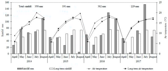 The weather conditions were given by the data of the meteorological station at the Dotnuva meteorological station. Rainfall and mean air temperature at the experimental site over the four growing seasons are provided in Figure 1. The hydrothermal conditions of the pea growing seasons were described using the hydrothermal coefficient (HTC) as the agrometeorological indicator, which was calculated according to the formula: