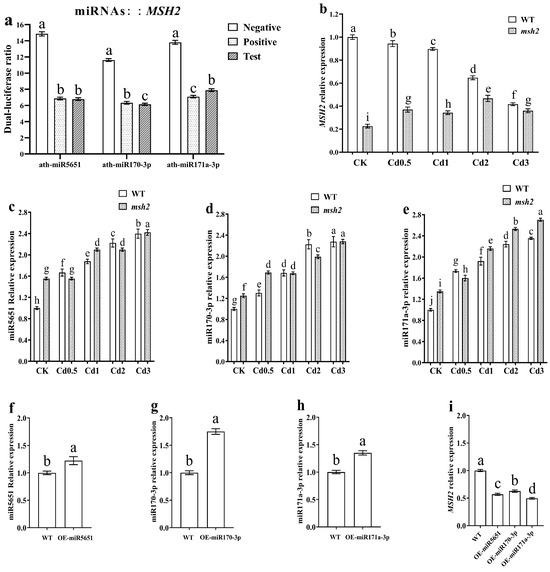 miR5651, miR170-3p, and miR171a-3p target and negatively regulate AtMSH2. The relative dual-luciferase activity in tobacco leaves (a): the three experimental groups shown from left to right correspond to miR5651, miR170-3p, and miR171a-3p—each co-infiltrated with their respective 3′ UTR expression vectors. The 3′ UTR vectors comprise negative control, positive control, and test constructs. “Positive Control” contains oligonucleotide DNA perfectly matching miRNAs, while “Negative Control” contains oligonucleotide DNA completely mismatched to miRNAs. The effect of Cd stress on the relative expression levels of AtMSH2 (b), miR5651 (c), miR170-3p (d), and miR171a-3p (e) in the WT and Atmsh2. The relative expression levels of miR5651 (f), miR170-3p (g), miR171a-3p (h), and AtMSH2 (i) in the miRNA overexpression transgenic Arabidopsis plants under control conditions, respectively. The gene expression level in the control (WT-CK) were set to 1 as the normalization for qRT-PCR analysis using the calculation method 2−ΔΔCt. Data are shown as mean ± SD of three independent experiments, and each biological replicates had three technical assays. Different letters indicate statistically significant differences between treatments at p < 0.05 by one-way ANOVA with Tukey’s test.