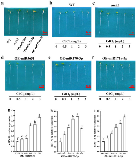 The effect of miRNAs targeting and regulating AtMSH2 on plant growth under Cd stress. (a) The phenotype of WT, Atmsh2, OE-miR5651, OE-miR170-3p, and OE-miR171a-3p under the normal culture condition. The phenotype of WT (b), Atmsh2 (c), OE-miR5651 (d), OE-miR170-3p (e), and OE-miR171a-3p (f) under the 0.5–3 mg/L Cd treatments. The relative expression levels of miR5651 (g), miR170-3p (h), and miR171a-3p (i) in their corresponding OE-miRNAs plants under the 0.5–3 mg/L Cd treatments. The genes expression levels in the control (WT-CK) were set to 1 as the normalization for qRT-PCR analysis using the operational formula 2−ΔΔCt. Data are shown as mean ± SD of three independent experiments, each biological replicate with three technical assays. Different letters indicate statistically significant differences between treatments at p < 0.05 by one-way ANOVA with Tukey’s test.