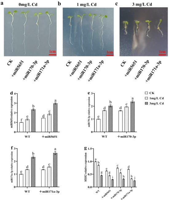 Exogenous miRNAs treatments on the plant growth of WT under Cd stress. (a–c) The effect of exogenous miRNAs treatments on the phenotype of WT under the Cd stress. The effect of exogenous miRNAs treatments on the relative expression levels of miR5651 (d), miR170-3p (e), miR171a-3p (f), and AtMSH2 (g) in WT under the 0, 1, and 3 mg/L Cd treatments. The gene expression levels in the control (WT) were set to 1 as the normalization for qRT-PCR analysis using the operational formula 2−ΔΔCt. Data are shown as mean ± SD of three independent experiments, and each biological replicate with three technical assays. Different letters indicate statistically significant differences between treatments at p < 0.05 by one-way ANOVA with Tukey’s test.