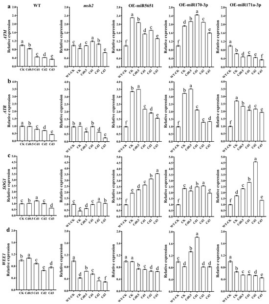 The effect of miRNAs targeting and regulating AtMSH2 on DNA damage response signal transduction under Cd stress. The relative expression levels of AtATM (a), AtATR (b), AtSOG1 (c), and AtWEE1 (d) in the WT, Atmsh2, OE-miR5651, OE-miR170-3p, and OE-miR171a-3p plant roots under Cd stress. The gene expression levels in the control (WT-CK) were set to 1 as the normalization for qRT-PCR analysis using the operational formula 2−ΔΔCt. Data are shown as mean ± SD of three independent experiments, and each biological replicate with three technical assays. Different letters indicate statistically significant differences between treatments at p < 0.05 by one-way ANOVA with Tukey’s test.