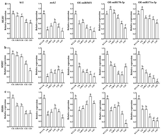 The effect of miRNAs targeting and regulating AtMSH2 on DNA mismatch damage repair under Cd stress. The relative expression levels of AtMLH1 (a), AtMSH2 (b), and AtMSH6 (c) in the WT, Atmsh2, OE-miR5651, OE-miR170-3p, and OE-miR171a-3p plant roots under Cd stress. The gene expression levels in the control (WT-CK) were set to 1 as the normalization for qRT-PCR analysis using the operational formula 2−ΔΔCt. Data are shown as mean ± SD of three independent experiments, and each biological replicate with three technical assays. Different letters indicate statistically significant differences between treatments at p < 0.05 by one-way ANOVA with Tukey’s test.