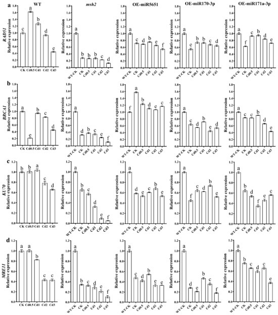The effect of miRNAs targeting and regulating AtMSH2 on DNA HR and NHEJ under Cd stress. The relative expression levels of AtRAD51 (a), AtBRCA1 (b), AtKU70 (c), and AtMRE11 (d) in the WT, Atmsh2, OE-miR5651, OE-miR170-3p, and OE-miR171a-3p plant roots under Cd stress. The gene expression levels in the control (WT-CK) were set to 1 as the normalization for qRT-PCR analysis using the operational formula 2−ΔΔCt. Data are shown as mean ± SD of three independent experiments, and each biological replicate with three technical assays. Different letters indicate statistically significant differences between treatments at p < 0.05 by one-way ANOVA with Tukey’s test.
