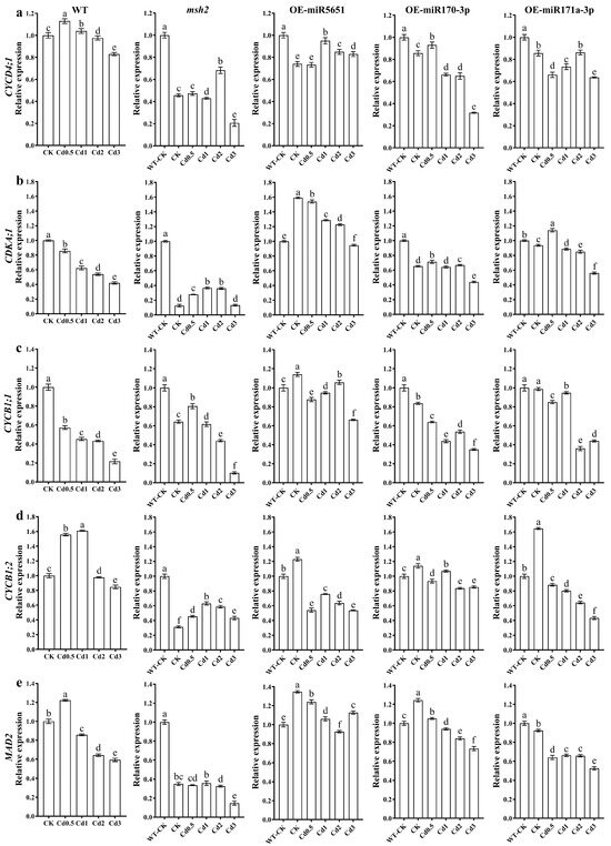 The effect of miRNAs targeting and regulating AtMSH2 on cell cycle regulation under Cd stress. The relative expression levels of AtCYCD4;1 (a), AtCDKA;1 (b), AtCYCB1;1 (c), AtCYCB1;2 (d), and AtMAD2 (e) in the WT, Atmsh2, OE-miR5651, OE-miR170-3p, and OE-miR171a-3p plant roots under Cd stress. The gene expression levels in the control (WT-CK) were set to 1 as the normalization for qRT-PCR analysis using the operational formula 2−ΔΔCt. Data are shown as mean ± SD of three independent experiments, and each biological replicate with three technical assays. Different letters indicate statistically significant differences between treatments at p < 0.05 by one-way ANOVA with Tukey’s test.
