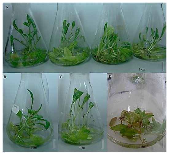 Example of shoot of Sarajevos widow flower (Knautia sarajevensis) cultures grown under different cytokinin concentration. (A) Media containing ZEA: from left to right 0, 1; 1; 2, 4 mg/L; (B) media containing 1 mg/L KIN; (C) media containing 4 mg/L KIN; (D) media containing no plant growth regulators [75].