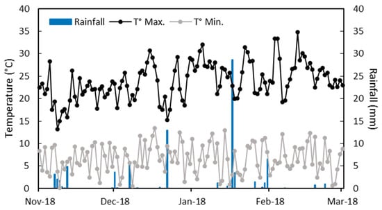 Daily values for maximum (T° Max.) and minimum (T° Min.) temperatures, and rainfall between sowing and harvest of F. esculentum.