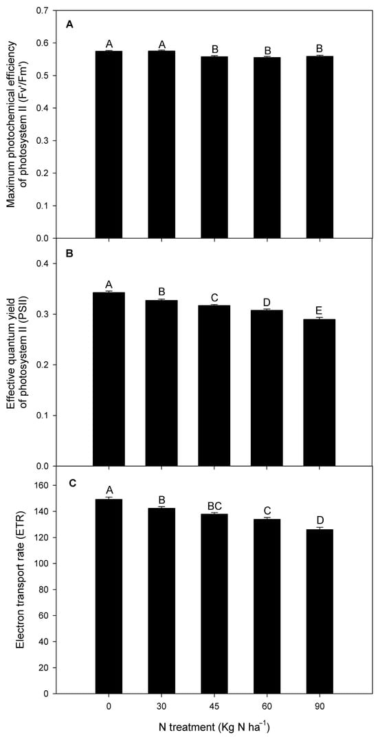 Chlorophyll fluorescence parameters. (A) Maximum photochemical efficiency of photosystem II in light-adapted leaves (Fv′/Fm′), (B) effective quantum yield of photosystem II (ФPSII), and (C) electron transport rate (ETR) in buckwheat (F. esculentum) subjected to nitrogen treatments (0, 30, 45, 60, and 90 kg N ha−1). Different uppercase letters indicate significant difference among treatments according to Tukey’s test (p < 0.05). The data are means ± SE (n = 5).