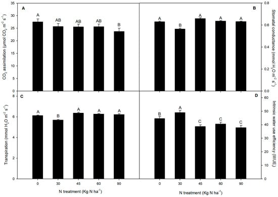 Gas exchange. (A) CO2 assimilation (Pn), (B) stomatal conductance (gs), (C) transpiration (E), and (D) intrinsic water use efficiency (WUEi) in buckwheat (F. esculentum) subjected to nitrogen treatments (0, 30, 45, 60, and 90 kg N ha−1). Different uppercase letters indicate significant differences among treatments according to Tukey’s test (p < 0.05). The data are means ± SE (n = 5).