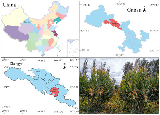 The experiment was conducted from April 2023 to October 2024 at Yimin Irrigation Experimental Station, Minle County, the middle part of the Hexi Corridor, Gansu Province (100°43′ E, 38°39′ N, 1970 m a.s.l.) (Figure 1). The climate in the experimental area is temperate continental. The average annual precipitation is approximately 200 mm, the evaporation is 1900 mm, the average annual temperature is 6.0 °C, and the frost-free period lasts about 105 d. The experimental soil is light loam, with a maximum field water-holding capacity of 24% in the tillage layer and a bulk density of 1.46 g cm−3. The 0–20 cm soil layer has a pH of 7.7 and an organic matter content of 11.9 g kg−1. The available phosphorus, available potassium, and alkali-hydrolyzable nitrogen contents are 17.3 mg kg−1, 174.9 mg kg−1, and 63.1 mg kg−1, respectively, indicating moderate fertility. The precipitation and the average temperature over the experiments are shown in Figure 2.
