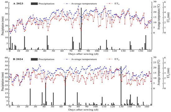 Daily variation of average temperature, reference crop evapotranspiration (ET0), and precipitation throughout the maize and soybean growing seasons in the strip intercropping system of 2023 (A) and 2024 (B).