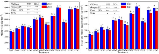 Water and nitrogen are essential elements for crop growth and development, and the interaction between the two factors is closely related to crop growth. An appropriate water–nitrogen ratio can effectively enhance fertilizer efficiency, promote crop growth, improve yield components, and increase dry matter accumulation and yield [25,26,27]. Siva Lakshmi et al. [28] found that appropriate water and nitrogen rates could improve maize yield components and increase 100-kernel weight, but the yield increasing effect gradually weakened with a higher irrigation amount and nitrogen application rate. Ma et al. [29] demonstrated that excessive irrigation and nitrogen application both reduced maize 100-kernel weight and kernel number per ear. Therefore, appropriately reducing water and nitrogen inputs can effectively increase the yield components. The results of this study have demonstrated that an optimal water–nitrogen combination could effectively improve the hydro-fertilizer environment for maize growth, enhance dry matter accumulation, and optimize yield components, thereby laying the foundation for high maize yields. These findings further validate the research conclusions of Siva Lakshmi et al. [28] and Ma et al. [29]. Furthermore, the results of this study have revealed that the medium nitrogen and sufficient water level (N2W3) treatment achieved the highest maize yields, reaching 14,027.21 kg ha−1 in 2023 and 13,986.83 kg ha−1 in 2024, respectivley, representing an increase of 2.52%~138.85% compared to that of the other treatments. This indicates a coupling interaction between water and nitrogen in crop growth, demonstrating that maximum yield is not necessarily achieved by simply sufficient irrigation and nitrogen application. These findings align with the research of Saed-Moucheshi et al. [30] and Sinclair et al. [31], though the magnitude of yield improvement varied slightly due to differences in cropping systems, water–nitrogen management practices, and the environment of the experimental areas. Li et al. [32] confirmed through research in a maize–wheat strip intercropping system in a semi-arid area that supplementary irrigation and optimal nitrogen application alleviated the interspecific competition, promoted the recovery growth of intercropped maize, and improved the yield of the wheat/maize intercropping system. Moreover, the nitrogen application rate of maize was 300 kg ha−1, which was similar to that of the nitrogen fertilizer dosage in this experiment, but the supplementary irrigation amount was significantly lower than that used in this experiment. Therefore, in semi-arid and sub-humid areas, where water is a limiting factor and the effect of nitrogen fertilizer is limited by water, we must strengthen the management of water, and water management should take precedence over nitrogen fertilizer.