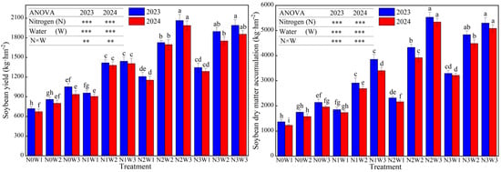 Water–nitrogen interaction effects on soybean yield and dry matter accumulation in the strip intercropping system. Bars and error bars stand to represent averaged values ± standard errors (n = 3), different lowercase letters indicate significant differences among the treatments (p < 0.05), the ** and *** indicate significant differences among the different treatments at the levels of p < 0.01 and p < 0.001.