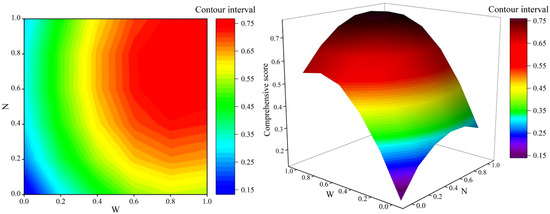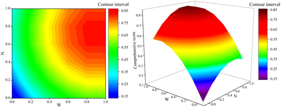 A hierarchical model for the comprehensive evaluation of maize was established using Yaaph V10.3 software (Table S1). The AHP method and the entropy weight method were employed to assign weights to individual indicators of maize, and the weights of each maize indicator were calculated (Tables S1 and S2). In order to improve the reliability and scientific accuracy of the weight assignment values, and to avoid the influence of subjective factors on the evaluation, a basic weight set was constructed on the basis of the two assignment values obtained (Table S3). The evaluation based on the TOPSIS comprehensive model with combined weighting involves normalizing the decision matrix, constructing a weighted matrix, and then calculating the ideal solution and closeness coefficient for each evaluation indicator (Table 7). From Table 7, it can be observed that the N2W3 (medium nitrogen and sufficient water levels) treatment achieved the highest closeness coefficient for maize, indicating the best comprehensive performance, followed by the N3W2 (high nitrogen and medium water levels) and N3W3 (high nitrogen and sufficient water levels) treatments. In contrast, the N1W1 (low nitrogen and low water levels) treatment had the lowest closeness coefficient, indicating that the comprehensive performance was the worst.