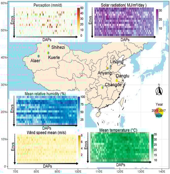 While numerous studies have examined the impact of environmental conditions on cotton yield and fiber quality, the majority have primarily focused on a limited number of climatic factors [18,30,31]. Few studies have successfully deciphered the effects of various climatic conditions on phenotypic traits at different growth stages of the plant across diverse environments. Therefore, a comprehensive approach that considers the influence of meteorological factors, including temperature, perception, humidity, radiation, and wind speed over multiple years and locations based on ML, is essential for a thorough understanding of environmental effects on cotton yield and quality parameters. This study aims to address three main objectives: (1) to evaluate significant variations in cotton fiber quality across years in response to regional climatic conditions; (2) to identify key environmental factors responsible for these variations and their critical temporal windows; and (3) to optimize prediction models by integrating these key environmental factors to better understand how genotypes respond to environmental variations.