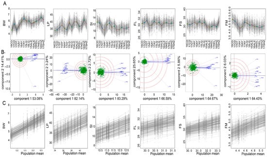 The GGE biplot analysis demonstrated that the first two principal components collectively accounted for 67.49% of the BW variance, 85.38% of the LP variance, 86.01% of the SI variance, 72.24% of the FL variance, 70.55% of the FS variance, and 70.46% of the FM variance, with the first principal component explaining the majority of the total variance (53.08% for BW, 82.14% for LP, 83.29% for SI, 66.59% for FL, 64.67% for FS, and 64.43% for FM) (Figure 2B). Across all 14 environments, comparable discriminative capacities were observed for phenotypic differentiation, with positive correlations existing between individual environments and the mean environment. However, environment-specific maximal discrimination emerged: 17CD exhibited peak differentiation efficacy for the BW and FS traits, 15AY for the LP/FL/FM traits, and 16CD for the SI trait, while environmental stability patterns among materials showed relatively homogeneous spatial distribution.