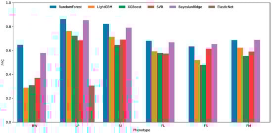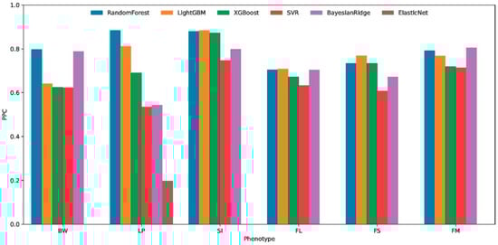 The cross-environment predictive performance of six machine learning algorithms was systematically evaluated using 7-fold cross-validation across six distinct phenotypes (BW, LP, SI, FL, FS, and FM). Performance metrics, including the Pearson correlation coefficient (PPC Figure 3), the coefficient of determination (R2), and the mean squared error (MSE), revealed substantial variations in algorithm effectiveness. Among the compared algorithms, Random Forest demonstrated superior and consistent performance across multiple evaluation metrics. For BW phenotype predictions, it achieved the highest R2 (0.403) and PPC (0.646) with the lowest MSE (0.314). This pattern persisted in the LP (R2 = 0.719, PPC = 0.861), SI (R2 = 0.670, PPC = 0.822), FL (R2 = 0.454, PPC = 0.678), FS (R2 = 0.396, PPC = 0.633), and FM (R2 = 0.469, PPC = 0.686) phenotypes.