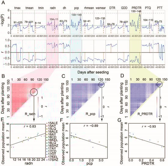 Analysis of key environmental factors for BW by CERIS. (A) Evolution of statistical significance (−log(P)) and correlation coefficients (r) between BW and multiple environmental variables from 1 to 150 days after seeding. Environmental factors include the maximum (tmax), mean (tmean), and minimum temperature (tmin), radiation (radn), sunshine duration (dh), perception (pcp), the mean relative humidity (rhmean), the mean wind speed (wsmean), the diurnal temperature range (DTR), growing degree days (GDDs), the perception per diurnal temperature range (PRDTR), the photothermal quotient (PTQ), and Photothermal Time (PTT). (B–D) Heatmaps of the correlation coefficients (R) between BW and specific environmental factors: radn in (B), pcp in (C), and PRDTR in (D). Linear regression analysis of boll weight and key environmental factors at critical windows of radn (E), pcp (F), and PRDTR (G).