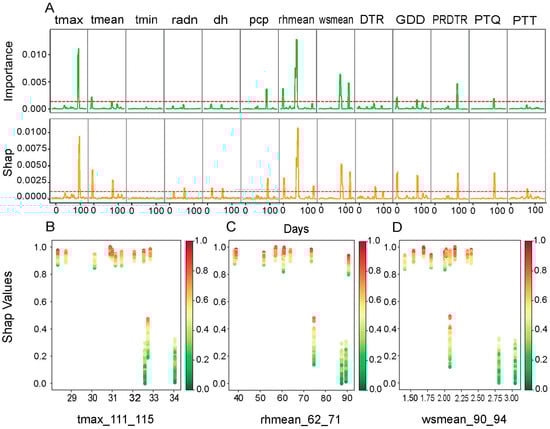 Analysis of key environmental factors for boll weight (BW) by Random Forest. (A) Variable importance and SHAP values of environmental factors over time. The upper panel is divided into two sub-sections. The upper section (importance) shows the relative importance of each environmental factor (tmax, tmean, tmin, radn, dh, pcp, rhmean, wsmean, DTR, GDD, PRDTR, PTQ, and PTT) in predicting BW, as determined by the Random Forest model. The lower section (Shap) presents the SHAP values for each environmental factor over time. SHAP values quantify the contribution of each factor to BW prediction, allowing for the identification of periods when a factor has a significant positive or negative impact. The red dotted line represents the top 10% of key environmental factors based on their importance and SHAP values. (B–D) SHAP dependence plots for key environmental factors. (B) SHAP values as a function of the maximum temperature (tmax_111_115); (C) SHAP values as a function of the mean relative humidity (rhmean_62_71); (D) SHAP values as a function of the mean wind speed (wsmean_90_94).